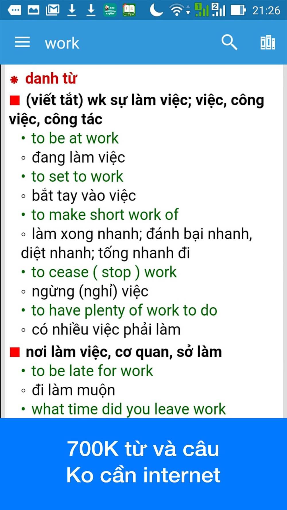 Vietnamese Dictionary Dict Box is an excellent tool for those who are learning Vietnamese and English and want to improve their vocabulary for work and communication. We offer a precise system for explaining words and simple and easy-to-understand examples. You can also add text translations or simple idioms to learn more about Vietnamese culture and people.SUPPORT EXPLAINING THE MEANING WITH MANY DIFFERENT EXAMPLESVietnamese Dictionary Dict Box is a simple-to-use application combining various features to effectively support your bilingual learning process. We provide a system of simple and extremely detailed explanations for every word you look up. Users can look up parallel vocabulary in Vietnamese and English. We designed it to integrate with the looked-up words to remind you of the lesson. You look up di