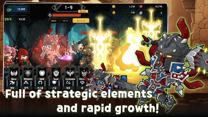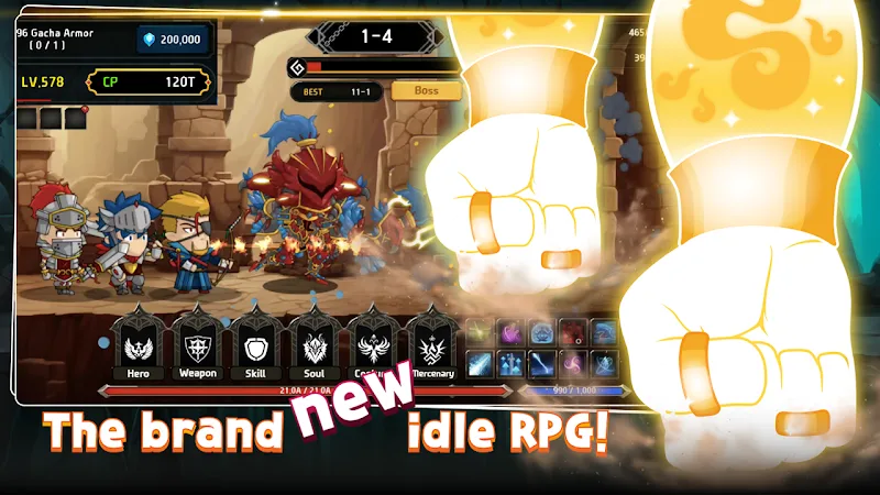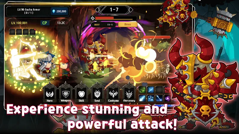 Vip Mega Knight Idle Rpg Premium se rewards play an important role in strengthening the squad.Boosting Unique Equipment: The developer provides special costumes and mini soldiers to greatly increase stats. This upgrade gives players many opportunities to optimize the squad.STUNNING ATTACKSAlthough this is only a 2D game, the developers have not really disappointed gamers with the beauty of the combat phases. Your character will, along with his soldiers, create explosive attacks that make players feel very satisfied.Thrilling Co