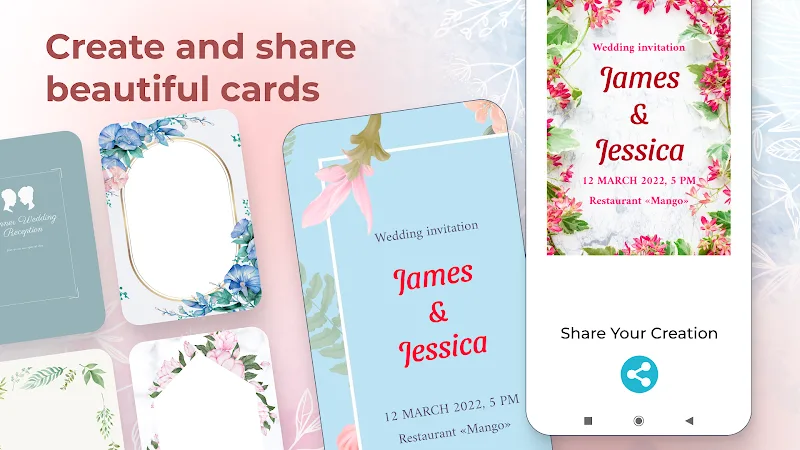 Wedding Invitation Card Maker supports users to create their wedding invitations. Personalization creates impressive cards. Diverse custom design templates. Easily add personal photos to enhance professionalism. Bring perfection to your wedding.CUSTOMIZABLE TEMPLATESWedding Invitation Card Maker helps users create a personalized experience by creating their own cards. A variety of designs helps create uniqueness. Each card bears the user’s mark with a personal story. A series of designs from modern to classic ensure the needs of use.Easy De