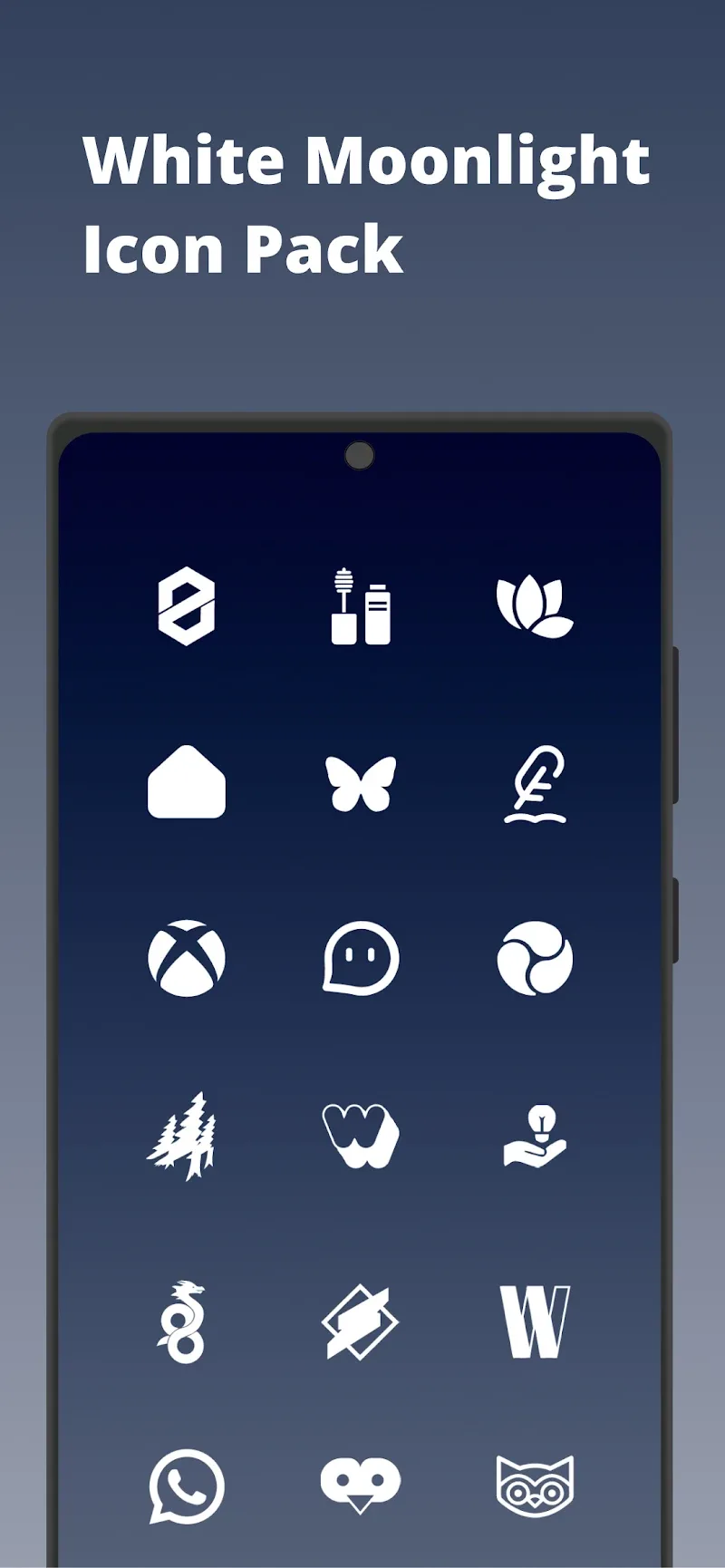 White Moonlight Icon Pack Premium mless, and complementary beauty for your device.Simple and sophisticated aesthetics: Simple yet sophisticated design is one of the basic features of the application that conveniently and effectively complements any home screen.COMPREHENSIVE APP SUPPORTThe application updates its icon patterns and wallpapers according to intuitive themes that can be selected for your device. This new information is displayed on the user’s topic page, so that the user can immediately see and know about the new changes. New, modern customization features have been added to allow y