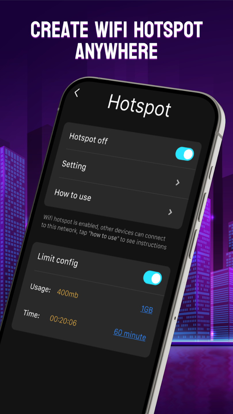 Wifi Password: Wifi Hotspot is an application that helps you use and manage your personal wifi network quickly and optimally. With this application, you will quickly be able to manage the speed, visitors, and many other features of your personal wifi. The application will also provide you with features and tools so that you can use and manage it more easily. What are you waiting for? Come to this application right away.CREATE WIFI HOTSPOTWith this application, you can create wifi access