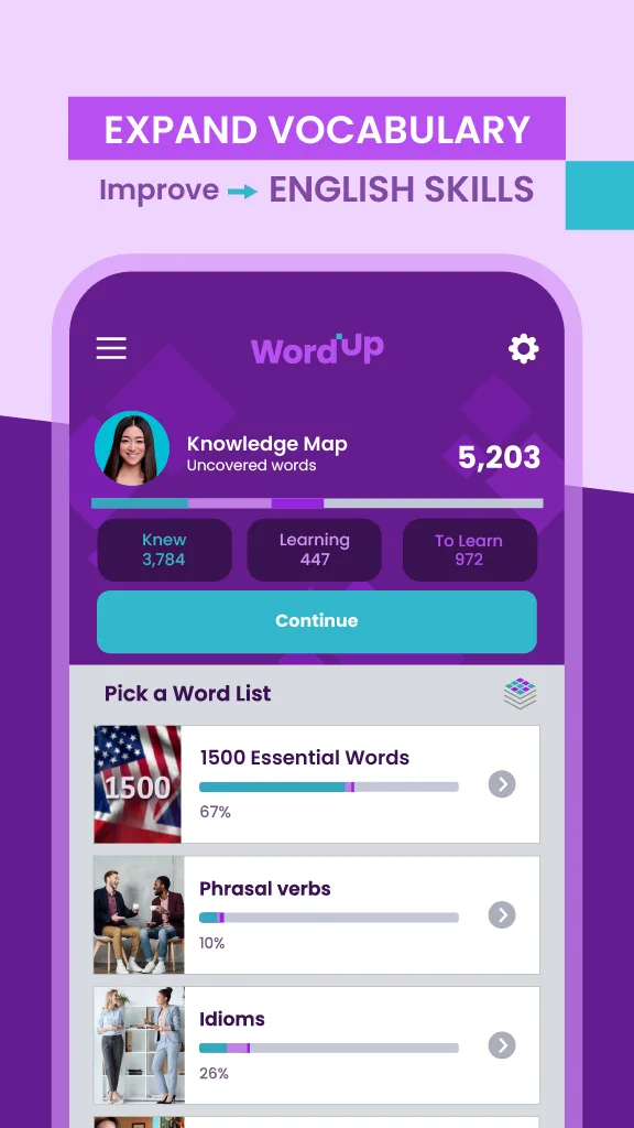 Wordup liteapks Useful Words Ranking: The application also has a ranking table, ranking popular and important vocabulary in real English use in order from high to low. This helps you choose vocabulary to study that suits your learning needs.Vocabulary Gaps: The application will test your vocabulary and determine its level. Then, it will suggest new vocabulary suitable to your current level. So you can learn and remember it easily.Track Progress: The application will report your results and learning path and notify you. This will help you easily track and understand your study progress.